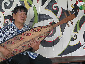 The weapons of war used by the orang ulu especially the Kayan and Kenyah are generally the wooden shield, the sword and the spear. The prized weapons are often decorated with human hair from the rewards of warfare. They accentuate the beauty of their weapons with designs which they also lend to designs in tattoo, beadwork, as murals to adorn the house walls, tombs, boats and Padi barns, woodwork and musical intruments. One of the musical instrument much regarded in the Rainforest festival is the Sape.