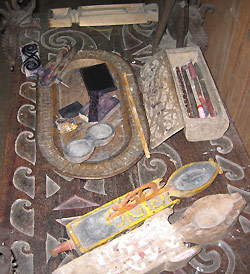 The tools used by a tatoo artist consist of two or three prickers, ULANG or ULANG BRANG, and an iron striker, TUKUN or PEPAK, which are kept in a wooden case, BUNGAN. The pigment is a mixture of soot, water, and sugar-cane juice, and it is kept in a double shallow cup of wood, UIT ULANG. The best soot is supposedly obtain ed from the bottom of a metal cooking-pot. The tattoo blocks are commonly carved by men. The artist first dips a piece of fibre from the sugar-palm (ARENGA SACCHARIFERA) into the pigment and, pressing this on to the area to be tattoed, aligns the patterns to be tattoed; along these straight lines the artist tatus the IKOR. Then taking the tattoo designs that are carved on blocks of wood, KELINGE, she smears it with the ink and then impresses on the part to be tattoed between the two lines. It is a painful process with no anaesthesia.