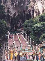 It is 11.30pm on the eve of Thaipusam, a time when the crowd is manageable and the cool night air brings forth a concoction of dizzy, soothing, intoxicating scents to slip us into a mood for a long, invigorating night. (The KTM trains and LRT schedules have been extended to shuttle devotees to Batu Caves to prepare for the day). For others it is to witness the arrival of the silver chariot carrying Lord Murugan heavily adorned with diamonds, rubies, sapphires and other precious stones. The deity is seated snugly on a bed of flowers encircled by burning incense on the chariot, which is pulled by two garlanded oxen and hundreds of devotees, also accompanied by religious dignities, musicians and dance (kolattam) groups. The silver chariot weighing all of 5 tonnes is transported through a 15km journey from town centre. The entourage leaves the Sri Mariamman Temple in Chinatown where for most of the year, the chariot and Lord Murugan's idol is housed for safekeeping. The journey takes 8 hours to complete. As the chariot arrives at Batu Caves, devotees carry Lord Murugan's idol up the 272 steps to the temple cave, an ascent of almost 185feet from the base of the steps.