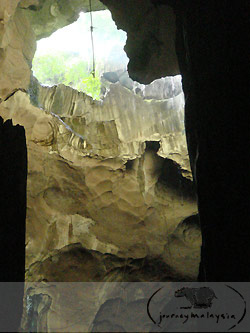 To the back of the Great Cave, flights of wooden steps takes me through a gaping hole into another cavern known as the Padang or Large Chamber. It is here that visitors may be able to catch the birdnest harvesters in action. There are bamboo and rattan ladders leading into tiny holes in the ceiling. The walk becomes more difficult as I shuffle along the slippery wooden walkway.