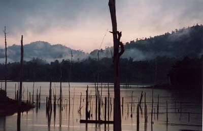 When the humans came to build a big dam before I was born, they came to take away the trees from the valleys and the low lands. Nenek remembers those days very well (). There was much activity in Kenyir. The big tree eating animals (tractors) were swarming around looking for big juicy trees to eat. Then one day, after the dam was completed, the big rains came. It rained for days and nights and flooded the whole valley! Many of the tree-eating animals (tractors) were trapped in the flood and they disappeared into the depths of the lake. Nenek believes that the humans had underestimated the forces of nature. They estimated that the water would only fill up over a time of 5 years but within a year, the lowlands and valleys were already submerged and in the deepest parts of the lake, it drops to about 151m(500feet) deep.