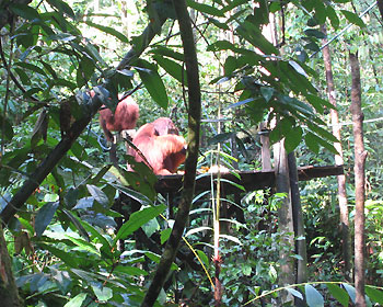 A feeding platform is located off the path some 10minutes walk into the jungle. This is where semi-wild orang utans are fed twice daily with a healthy mix of fruits, vitamins, bottles of milk with mixed boiled beans /sugar cane/sunflower seeds and fresh young coconuts. The ranger lays a buffet spread on the feeding platform and once that's done, he normally calls out to the orang utans by their names. Visitors are requested to keep as quiet as possible. In a few minutes or so, a rustling in the trees from the far distance, high up in the treetops signals the arrival of these great beings.
