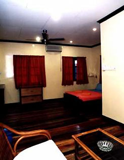 Room Description Superior Chalet ~ Twin and Double bedded, Air-conditioned, Tea and coffee making facilities available in the chalet, Attached bathroom with hot shower Standard Room ~ Twin and Double bedded, Air-conditioned, Attached bathroom with cold shower Longhouse / Hostel  (Dormitory room for group 3 adults) ~ onsist of 3 single bed in each room, Ceiling fan, Attached bathroom with cold shower