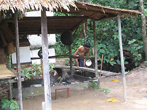 Being nomadic, the Penans eat almost anything the jungle has to offer except the omen birds, birds that the natives believe bring them warning signals etc. however, the one beast - the crocodile seems to be regarded as a god by the Penans. It's been recorded that the Penans do sometimes carve crude wooden structures of the beast and hang it at their hut or shelter. At any time that anyone should fall ill, the medicine man would hang the blossom of a betelnut tree with the wooden image to aid him in calling back the wandering soul of the patient.