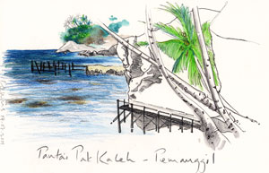 Okay, now before embarking on a trip like this for reasons only you can justify, first let's take into consideration the travelling time. Pulau Pemanggil sits 45kms east of Mersing, the take-off point to most islands off the Southern coast of Peninsular Malaysia. To get to Mersing itself takes 4½ hours by car or roughly 6hours by coach from KL (we shall use Kuala Lumpur as a point of reference) and from Mersing it takes another 4 1/2 hours (by traditional fishing boats) to paradise island . And of course, there is the waiting time to take into account - waiting for tidal changes, for boat, for coach, for tardy friends hitching a ride down with you. But then again, these are the little joys of travelling to far-off places for when you arrive, you know the tough journey has been all worth the effort - you have left the masses behind!