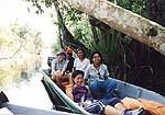 Any larger and we wouldn't be able to maneuvre through the narrow shallow canals created by the screwpines (Pandanus sp.). Having moved to the front of the boat, we realised that although we had the best view, it definitely wasn't the best seat in the house! Pushing into the narrow openings created by overhanging screwpine leaves - we found our new seating arrangement a big disadvantage. With rough overhanging rasau leaves constantly raking our faces and startled spiders dropping onto us time and again - we ended up pretty messy at the end of the ride