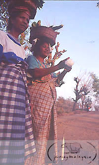 Weaving in Sabah has not had as much exposure compared to the Iban textile. Most hand-woven textiles in Sabah are not readily sold in the market. The Kadazans produce a black sarong interwoven with vertical and cross-wise strips similar to the Filipino styled langkit . A subgroup of the Kadazan, the Rungus, weave a cotton fabric called kain pudang . This textile uses a supplementary weft technique, producing an assortment of zigzags, triangles and rhombuses. The Rungus women are the only group in Sabah who still maintains the age-old tradition of homespun cotton threads and natural dyes for their textiles. Kain mogah , produced by the women of a Dusun subgroup is another fascinating hand-woven material, usually black and decorated with orange of white pin-stripes. The sarong requires two pieces of the woven fabric sewn together and worn with a silver belt and rings of rattan.
