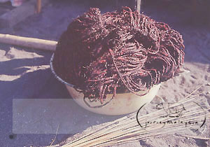In the early centuries of maritime trading, Indian traders brought the back-strap loom to Southeast Asia and introduced cotton as an alternative to bark-cloth textile. This primitive back-strap loom requires little effort in setting up. There is no rigid framework thus; the warp beam can be set up wherever there are two parallel upright poles. Often women are seen working at the verandah, in between house and field chores. The back-strap loom is portable, which befits the nomadic requirements and simplistic lifestyle of these communities. Most of the motifs and designs of the ancient forms of vegetable fibre textiles are connected to ceremonial rites and animistic values. Among the most renown and sought after textile are the cotton blankets called Pua Kumbu of the Iban tribe of Sarawak. The Iban tribe's lifestyle and beliefs are intricately woven into their textiles. As in many societies, weaving was always the work of women and her status in the community can be revealed from the type of motifs weaved. In the olden days, motifs with humanoid figures or anthromorphs (engkaramba) can only be weaved by wives and daughters of chiefs. These figures with raised arms and out-turned legs are representations of deities of the Iban's animistic religion and serves as a talisman to protect the wearer from danger as well as to ensure a bountiful harvest for the season. Although difficult to interpret, the motifs and colouring are usually inspired by the environment and reveal a lot about the Iban's rituals and beliefs. While most motifs are visual representations of animals, plants and even daily activities, others are more complex and abstract. Intricate patterns on the pua are often traditional and hereditary.