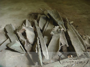 Up the stairs and into the sun again, walking along the ledge of the limestone wall.. leads me into the west mouth of the Great Cave . The first thing that struck me was a dig. Behind the fencing was where the archeological digs in 1957 first began. Under the flagship of Sarawak Museum and supervision of the museum curator, Tom Harrisson work was carried out meticulously; painstakingly removing small amounts of soil to reveal artifacts, history and life stories of the early inhabitants who came to Borneo and stayed possibly some 40,000years ago.