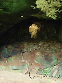 To the back of the Great Cave, flights of wooden steps takes me through a gaping hole into another cavern known as the Padang or Large Chamber. It is here that visitors may be able to catch the birdnest harvesters in action. There are bamboo and rattan ladders leading into tiny holes in the ceiling. The walk becomes more difficult as I shuffle along the slippery wooden walkway.
