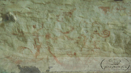 faint hermatite drawings to the back of the cave. it's difficult to make it out initially, but after a while of squinting, you may be able to see drawings of humans and sampans along the length of the wall |