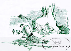 After a time at sea, the captain found themselves low on supplies and were forced to drop anchor at a tiny harbour carved into the edges of a thick jungle. (Then Batu Caves were much closer to the sea than it is now). The whole village turned up to greet the handsome Captain and his beautiful princess. As it were, the mother recognised her long-lost son and called out to him, 'Tenggang! My son, I knew you would come home!' Not willing to reveal his origins and be ridiculed by his crew and wife, Si Tenggang ordered the villagers to remove the 'mad woman' from his sight or he would get his crew to fire the cannons and kill them all. On hearing his commands, Si Tenggang's mother sadly whispered, 'I'm sorry. Do not harm them. I was mistaken. I see now that you are not my son.' As true words were spoken, the dark clouds loomed over, blackening the sky and the waves rose to great heights. The villagers - shocked by the strange phenomenon were at a loss as what to do, but as they turned to the ship's direction, they saw the ship, Si Tenggang, his wife and the entire crew turned into stone!