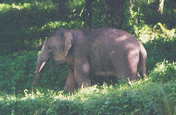 this young pygmy elephant is enroute from the reserve into the palm oil plantation in search of food. photo courtesy of sandra bakhsh and alex harth, germany. march 2006 |