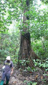 The laterite road took us to the borders of the reserve. We passed through a village, where many of the plantation workers lived amongst the villagers. Along the way, a lone rainforest tree, the Tualang tree towering above all else stands at about 100ft high. The tree would have been a little higher than the rainforest canopy 50yrs ago. Now it stands alone like the tower of babel, a morbid reminder of what it used to be. As we turned a sharp corner, we met up with some guests from the resort. They were standing about with binoculars and all. I was told that the elephants were nearby and anytime soon the male pygmy elephant will emerge from the bush on the regular walk through the secondary forest cover into the plantation in search of food. Tired and hungry, I decided it was best to skip the event, thinking the next day would be a better time to meet up with these creatures again. We took the turn and left for the resort.